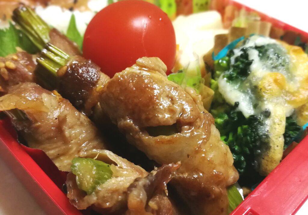 - アスパラガスを豚肉で巻いて焼肉のタレで味付け(昨日の残り)