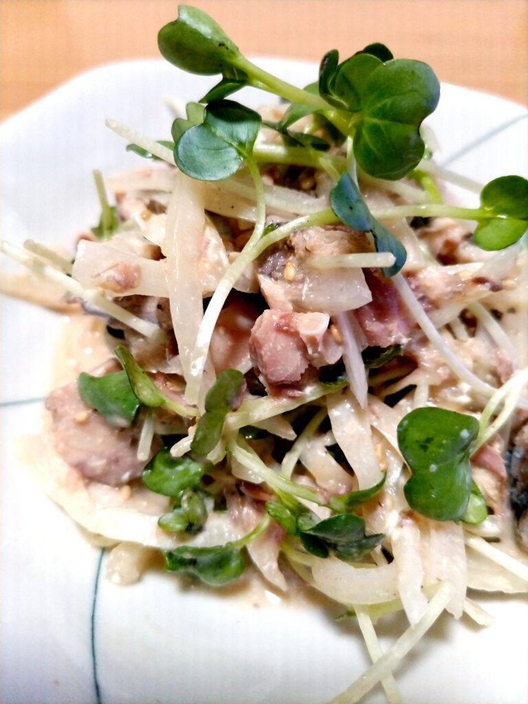 サバ缶と玉ねぎのスライスとかいわれ大根をポン酢とマヨネーズで和えました。