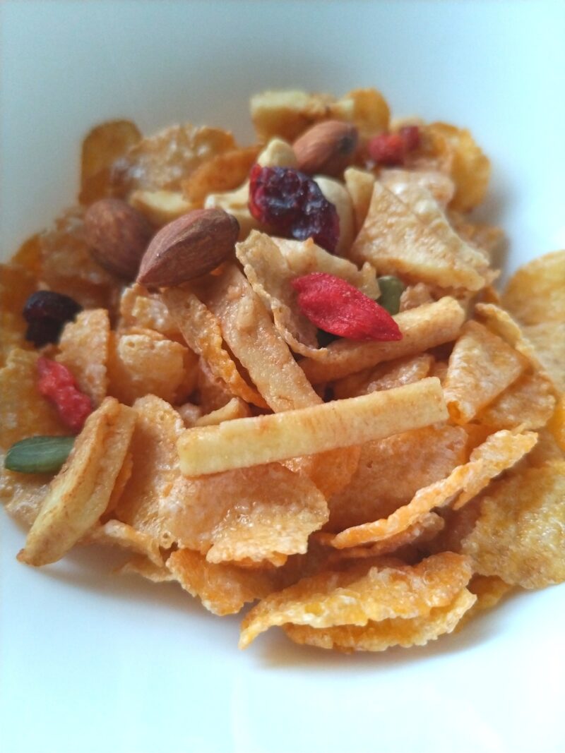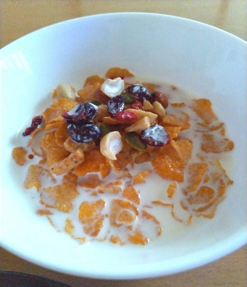 グラノーラは何故か食べるとお腹が張るので、コーンフレークにしています。